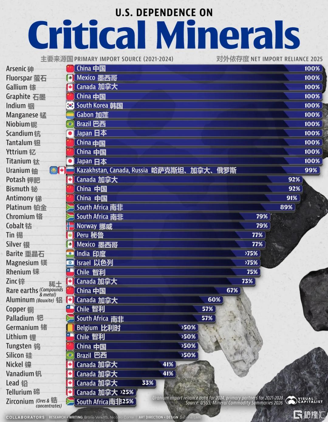 据美国地质调查局(USGS)的数据,美国对包括石墨、镓以及钪、钇等稀有元素在内的11种关键矿物完全依赖进口,另有21种关键矿物的对外依存度超过50%。中国在美国的矿产供应链中扮演着核心角色,是砷、石墨、钽、钇、锑以及稀土的主要来源国。下图展示美国对37种关键矿物的对外依存度(Net Import Reliance),以及2021年至2024年间的主要供应国。
