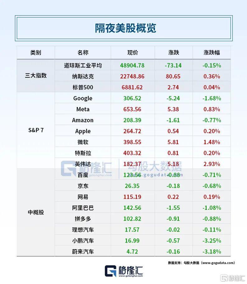 美股方面,三大指数涨跌不一,道指跌0.15%,标普500指数涨0.04%,纳指涨0.36%。大型科技股多数上涨,英伟达涨约3%,微软涨超1%,苹果、特斯拉、奈飞、Meta小幅上涨;谷歌跌超1%。美股能源股、加密货币概念股走高,旅游与航空股承压。中概股多数下跌,纳斯达克中国金龙指数跌1.08%。