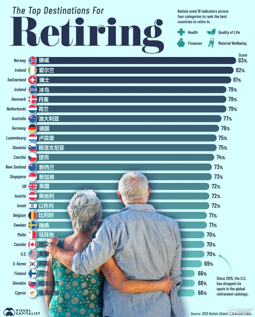 Natixis投资管理公司发布2025年全球退休指数,从退休财务状况、物质福祉、健康状况和生活质量四大方面对各国进行排名。其中,挪威蝉联第一,爱尔兰、瑞士、冰岛、丹麦、荷兰、澳大利亚、德国、卢森堡及斯洛文尼亚位列前十。新加坡的排名显著提升,从2015年的第25位升至第13位,主要得益于稳健的退休财务状况。